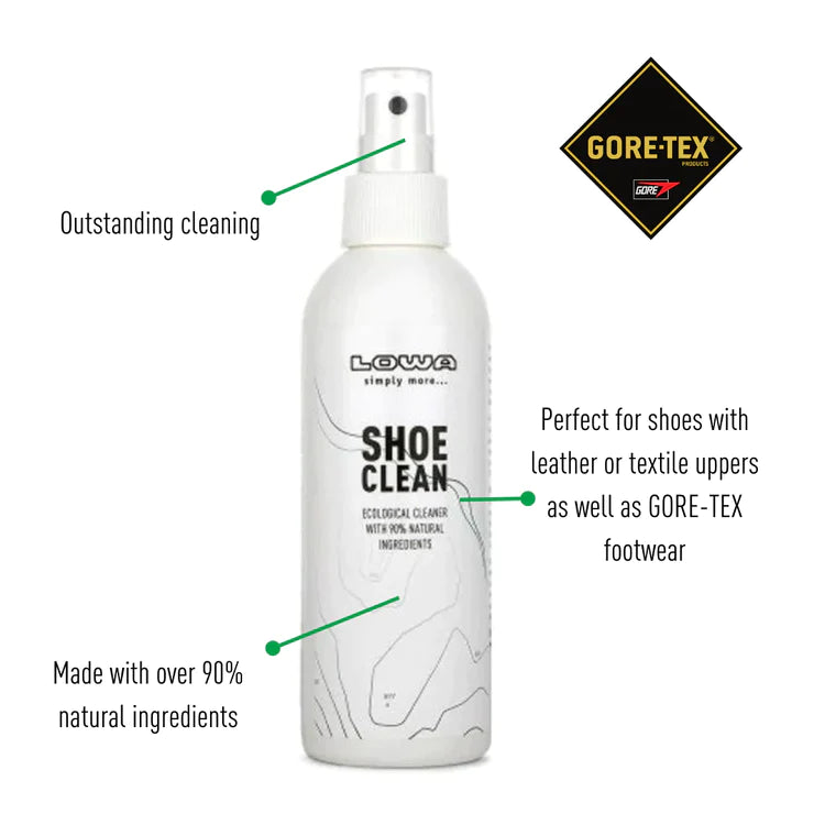 The new LOWA Shoe Clean Boot Cleaning Spray combines cleaning with additional care! It dissolves soiling effectively, moisturises the leather and thus protects it from drying out. Made from 90% natural ingredients, this protective boot care spray is almost completely free of raw chemical materials, relying instead on the cleaning power of natural bamboo extract. LOWA Shoe Clean is suitable for all smooth leather and suede shoes and boots, as well as combinations of textile materials. In combination with LOWA Active Creme or LOWA Active Creme Black and LOWA Water Stop Pro, it offers perfect protection for your LOWA boots and shoes. LOWA Shoe Clean is easy to apply and environmentally friendly thanks to its pump dispenser.